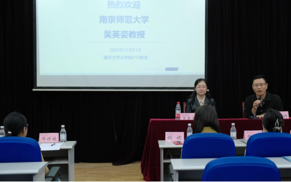 2025年11月21日,南京师范大学法学院吴英姿教授受邀到重庆大学法学院作“程序相称原理:民事法一体化研究”学术讲座。讲座由重庆大学法学院吴如巧教授主持,重庆大学法学院自正法教授、胡婧副教授以及助理研究员周婧媛、杨焘、苟应鹏等人参加了学术讲座。