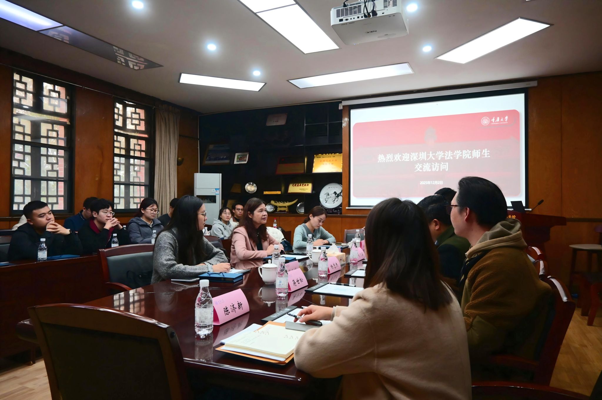 2025年12月2日上午,深圳大学法学院副院长周卫教授带队,师生一行十九人到访我校交流座谈。重庆大学法学院副书记杨志杰、副院长刘乃梁、研究生培养办公室主任蒋世松、研究生办公室主任柳青、研究生教务秘书陈济新以及研究生代表陪同参观、参与座谈。