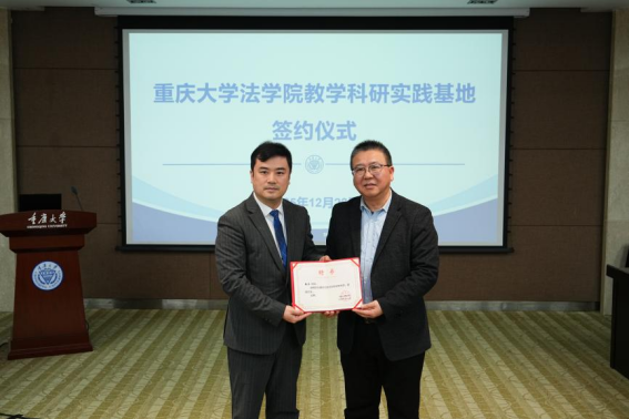 蒋研川向实务导师代表颁发聘书。在双方合作过程中,重庆百君律师事务所将陆续推荐有5年以上执业经验的合伙人律师或专职律师作为实务导师,参与重庆大学法学院课堂实践教学、学术讲座等。