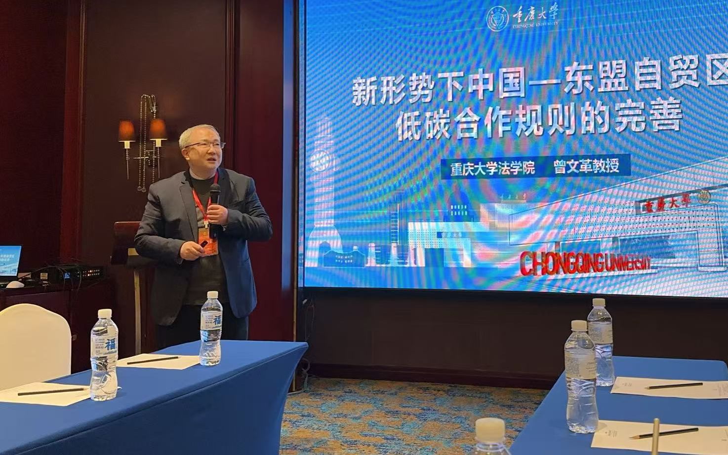 曾文革和博士生任婷玉(合著)提交了《新形势下中国—东盟自贸区低碳合作规则的完善》的会议论文,并做了相关发言。曾文革指出中国与东盟国家在应对气候变化领域具有相似的脆弱性背景,易遭受气候变化的不利影响,合作需求显著。当前,中国—东盟自贸区3.0版的签署,为双方低碳合作奠定了良好合作基础,但地缘政治和治理复杂性仍制约合作深化,使得多层次合作法律制度整体效能发挥有限,尚未形成制度化,资金规则和技术规则运行不畅,相关实施保障制度建设也存在一定程度缺失。曾文革提出以“气候命运共同体”理念为指导,建立软硬法并兼的合作复合机制,进一步推动“互惠互利”市场化资金和技术合作转让机制建立,在东盟国家尚未完全建立碳定价机制的基础上,可采用统一标准搭建MRV机制,探索与东盟国家开展区域碳市场链接可行性。他的观点获得了论坛与会人员的广泛认可。