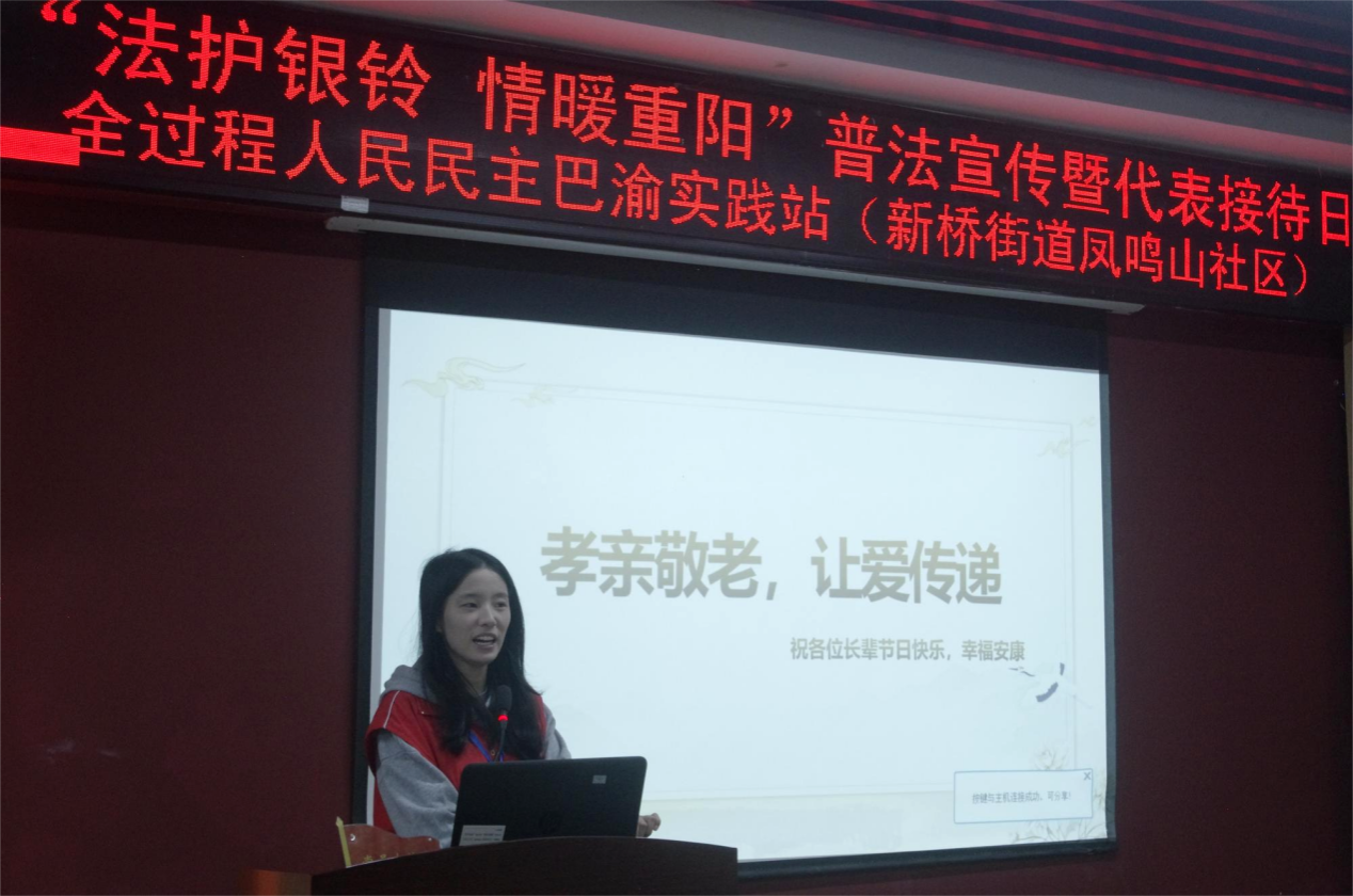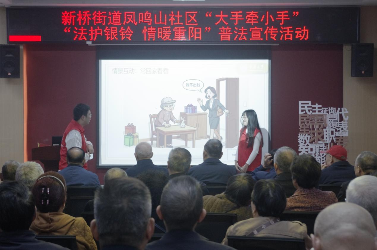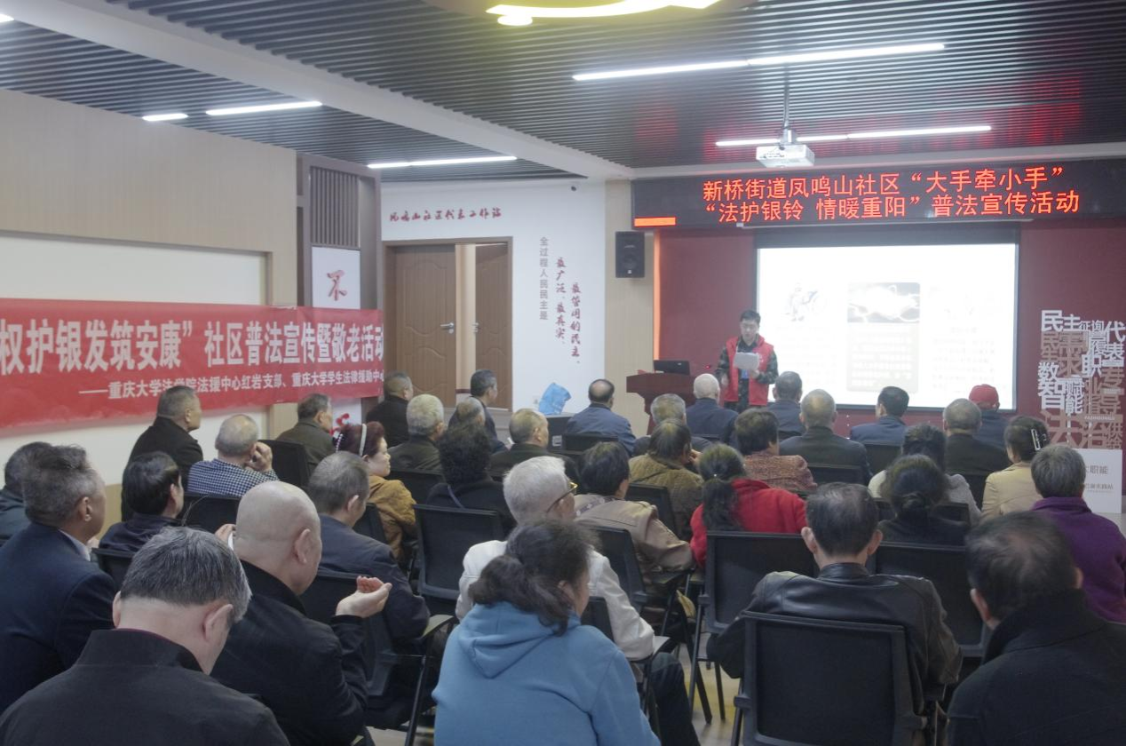 “老年人是党和国家的宝贵财富。”在重阳节到来之际,为切实保障老年人合法权益,弘扬“敬老、爱老、助老”的传统美德,2025年10月29日,重庆大学法学院在沙坪坝区凤鸣山社区红岩党群服务站开展“法润重阳添暖意,权护银发筑安康”普法宣传活动。本次活动由法学院法援中心红岩支部、重庆大学学生法律援助中心联合沙坪坝区凤鸣山社区居委会共同举办,通过主题宣讲、情景剧表演和趣味互动等形式普及法律知识,吸引众多老人积极参与。