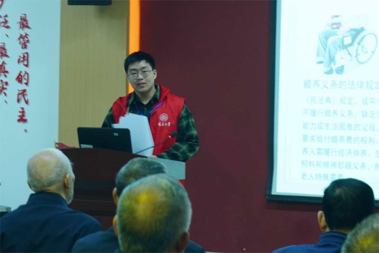 活动伊始,志愿者冉超越以“知晓法定权益,明晰维权途径”为主题开展普法宣讲,通过PPT展示与情景模拟相结合的方式,聚焦老年人关注的儿女的赡养义务、消费者合法权益保护、和业主权利等问题,逐一进行细致解读,并结合实际案例梳理各类问题的维权途径。宣讲过程中,冉超越还针对老年人常见的权益保障场景给出具体可操作的建议,如:购物时索要并妥善保存发票,向亲戚借款需签订借条,邻里纠纷时可以先向业主委员会求助,遵循“先和解、再调解,先投诉、再起诉”的维权思路,避免矛盾升级。