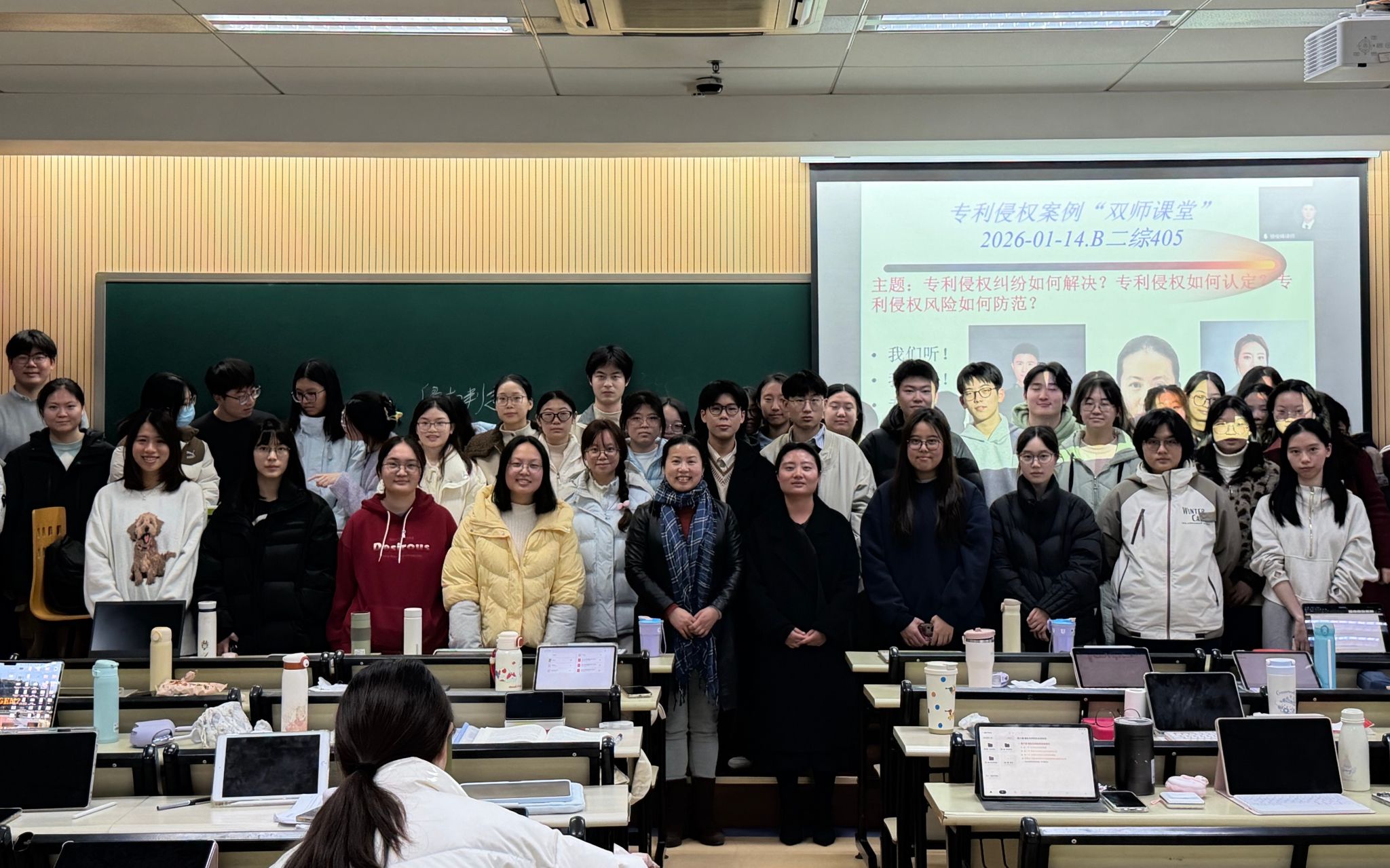 为持续推进《知识产权法》本科教学创新,促进理论知识传授与实务能力培养有机融合,2026年1月14日下午,重庆大学法学院李晓秋教授邀请重庆公孝律师事务所余丽律师、北京德恒(宁波)律师事务所高级合伙人骆俊峰律师走进课堂,就共同参与的案件开展“双师同堂”专题授课。本次课程以“专利权侵权行为认定与法律责任”为主题,采用“理论引导+实务对话”的双线教学形式。