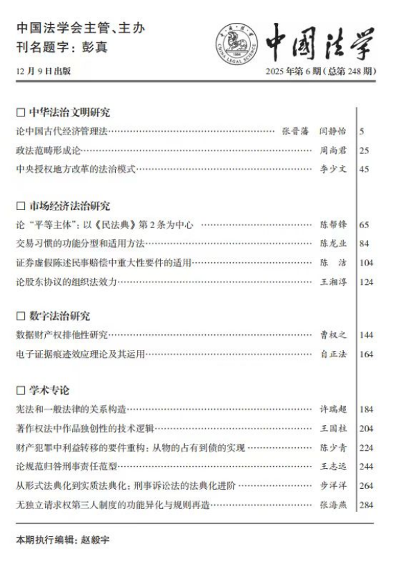 近日,重庆大学法学院自正法教授在《中国法学》2025年第6期发表论文《电子证据痕迹效应理论及其运用》。