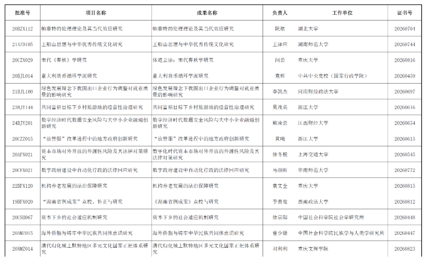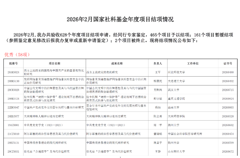 近日,全国哲学社会科学工作办公室公布了2026年2月国家社科基金年度项目结项情况,重庆大学法学院袁文全教授主持的国家社科基金项目“机构养老发展的法治保障研究 ”(项目号22BFX120)通过结项鉴定,结项等级为“优秀”。