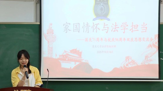 金秋送爽,丹桂飘香。在中华人民共和国成立76周年与重庆大学建校96周年的双庆背景下,法学院团委学生会于2025年10月16日在法学院107会议室开展“家国情怀与法学担当”主题思想交流会。法学院团委书记张雅莹及团委学生会全体成员参加了本次交流会,组织部负责人唐雨琪担任主持人。