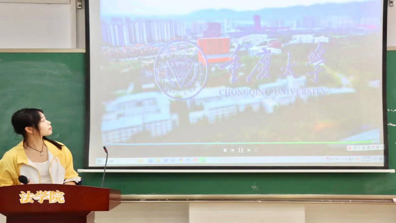 会议伊始,唐雨琪以国庆与校庆为切入点,发起对于“法学学子如何将家国情怀转化为守护公平正义的实际行动”的探讨。随后,现场播放重庆大学宣传片,通过光影镜头回顾学校自1929年建校以来的发展历程,诠释了“耐劳苦、尚俭朴、勤学业、爱国家” 这一校训背后蕴含的重大精神,让在场学子深刻感受到母校发展与民族命运同频共振的深厚底蕴。