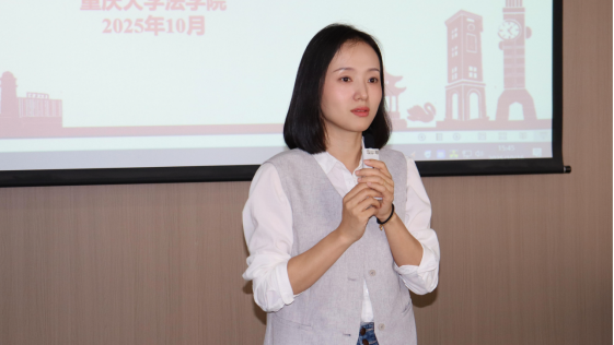 孙思雨代表上一届法学院研究生团委学生会作学年度工作总结。她说到,上一学年度,研究生团委学生会在学院党委的领导支持下,紧密围绕学校、学院的工作安排,开展了一系列具有专业特色的品牌活动,取得了良好的工作成效。去年六月,法学院研究生分会获评重庆大学优秀研究生分会。随后,她从组织建设、部门协调、活动策划、亮点宣传等方面进行了重点分享,为新一届工作开展提供实践参考。