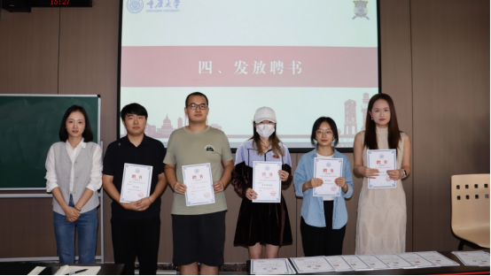 汇报结束后,柳青为上一届法学院研究生团委学生会成员代表颁发聘书。