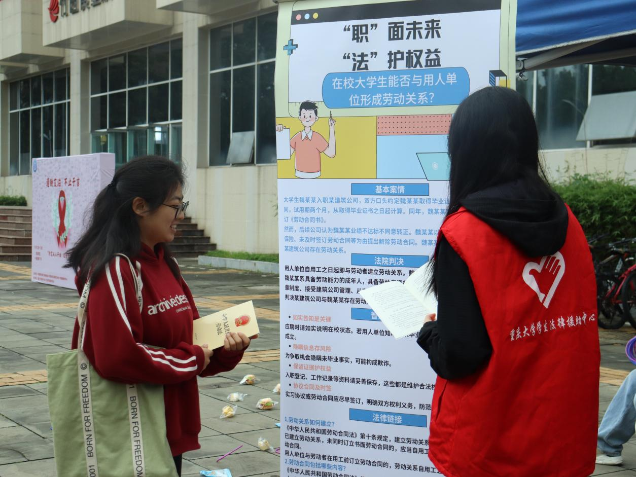 为增强大学生法律意识,帮助学生在实习、求职过程中有效防范风险、依法维护自身权益,2025年11月15日,重庆大学学生法律援助中心在科学城校区虎溪校园一食堂南广场举办“‘职’面未来,‘法’护权益”劳动法普法活动。本次活动由法学院法援中心红岩党支部、重庆大学“一站式”学生社区、重庆大学学生法律援助中心联合组织开展,通过案例讲解、互动游戏和法律咨询等形式,为广大学生带来一堂生动的“职场法律第一课”。