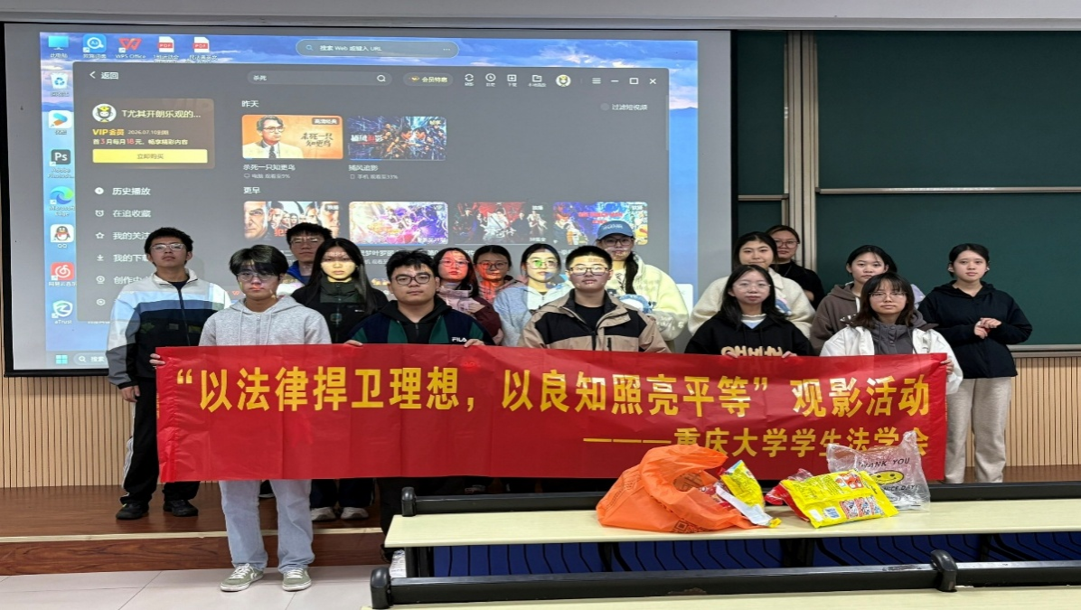 为弘扬时代主旋律,强化学生的法治观念,2025年11月23日下午2:00,重庆大学学生法学会在沙坪坝校区B校园第二综合楼418教室开展“以法律捍卫理想,以良知照亮平等”主题观影活动。本次活动组织学生共同观看电影《杀死一只知更鸟》,吸引了众多同学参与。