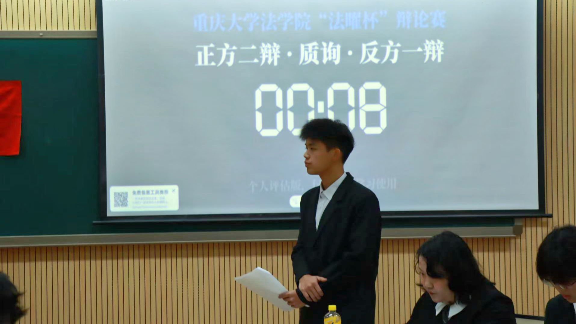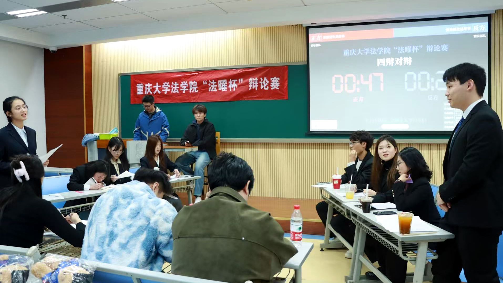2025年12月7日晚七点,重庆大学法学院首届“法曜杯”辩论赛半决赛于沙坪坝校区B校园第二综合楼310、311教室同步举行。赛事由法学院团委学生会主办,学生模拟法庭协会与法学院辩论队联合承办,法学院团委学生会全体成员及数十名学生观众到场观赛。