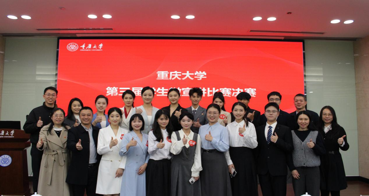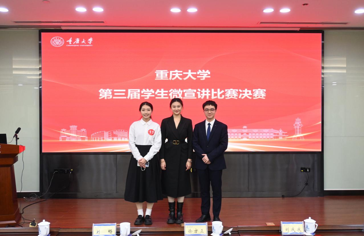 2025年12月18日19:00,重庆大学第三届学生微宣讲比赛决赛在沙坪坝校区A校园主教学楼504会议室成功举办。本次比赛由中国共产党重庆大学委员会主办,旨在引导青年学子坚定理想信念、厚植家国情怀。法学院王嘉怡、王诗语馨和王乾沣三位本科同学代表学院参赛,最终获得三等奖一项、优秀奖两项。